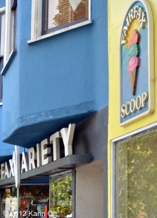 Fairfax Scoop serves homemade organic ice cream, and on weekends people stand in long lines. Not this day. The girl with the ice cream and the colorful table accentuates the interior, the reflexion in the store front shows us the surroundings. The result is a pictures that shifts, depending on what you focus on.
