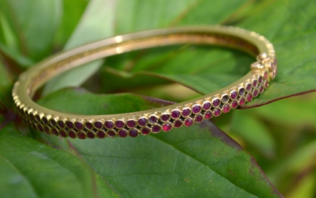 I bought the bracelet in India – in Chennai. Though the jewlery stores there are five stories high, I found this unique piece with 164 bezel set little rubies in an artisan shop, Amethyst – a combined caf and artisan store set in a lush, tropical garden.