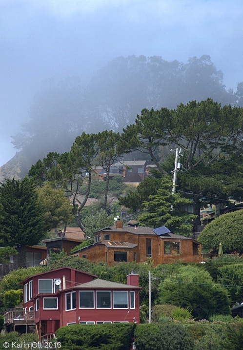 On a fortunate morning in February, there was frost on the ground and fog in the air. I couldn’t get the kids to school fast enough, threw my camera in my car, and headed straight for the beach. I was hoping the fog would hold and it did. This is from the lawn behind the marina by the beach. The round doughnut looking things are orange benches.
