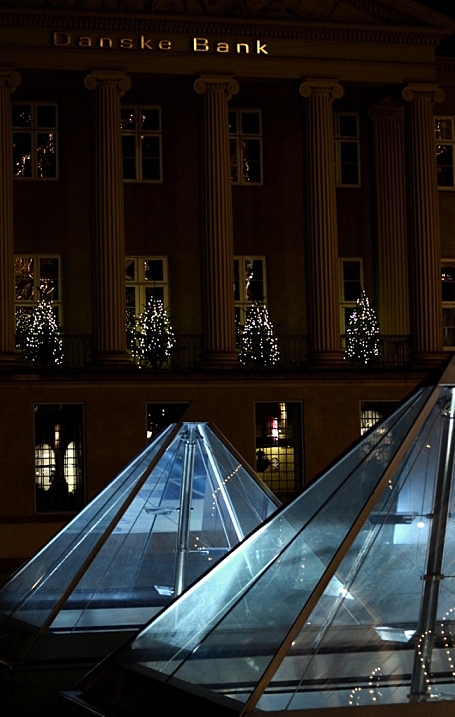 I’m always happy when a photo combines different qualities of light – The Metro prismens of Copenhagen, Kongens Nytorv, against the christmas trees and the golden sign on the building in the background.