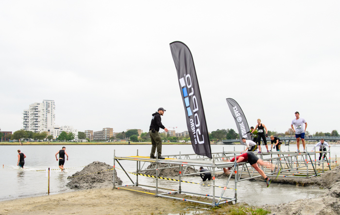 Here the runners had to walk the line along a metal pipe. It sounds manageable but the whole construction shook when more than one person tried to cross. If you fell down, there was a detour around some poles in the water.