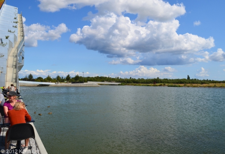 The 8 Number lies at the Southern most end of Ørestaden – a new city district being built on Amager, a few kilometers from the center of Copenhagen. The complex overlooks Vestamager – a nature reserve. What you see in the picture is the café and the view of Vestamager. A row of artifical lakes have been established at the edge of Ørestaden.