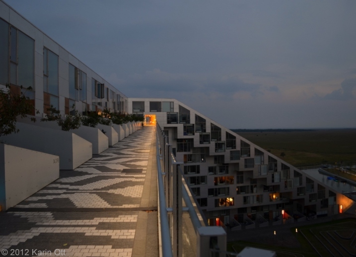 In a country with no mountains or hardly even hills the objective of The 8 House – to build a mountain village – really stands out. In the background is the unrestircted view of the preserved area Vestamager.